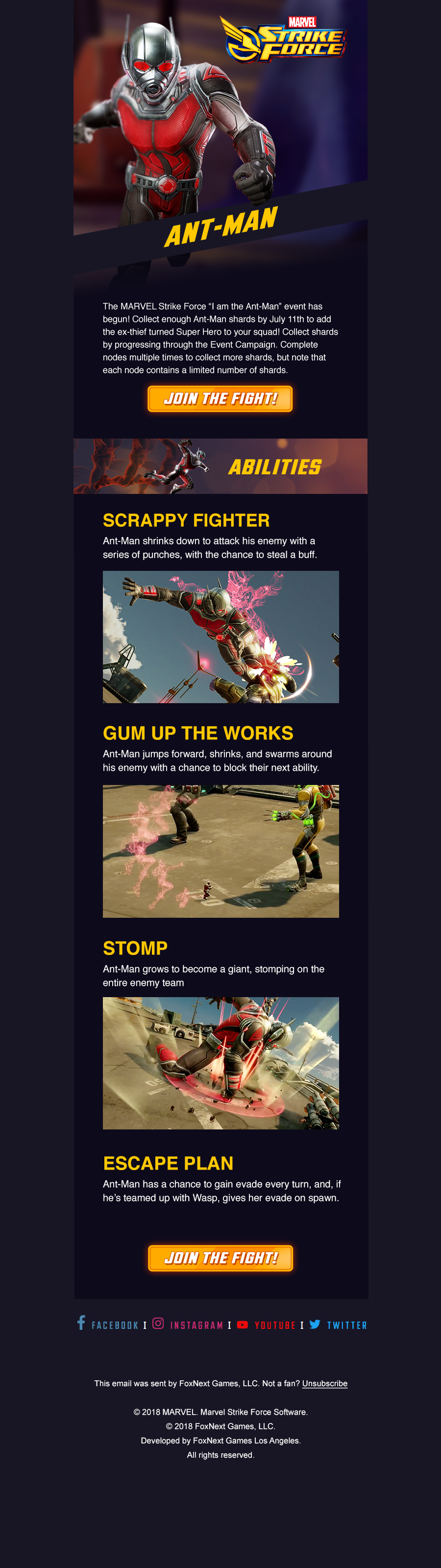 Previous to, and after launching the mobile game, “Marvel Strike Force”, in Spring 2018, I, as a contracted part of a small marketing team, created a variety of assets including required App Store submissions, social media “sharables”, Comic-con pieces, videos, bus ads, wallpapers, and more. Thanks to the tremendous skill of 3D-modelers and illustrators, I was able to re-purpose in-game stills and key art to create a variety of consumer-facing projects.